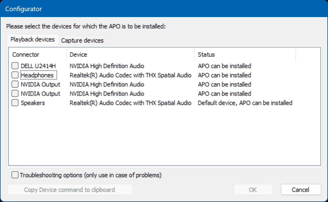This is where you can access the Equalizer APO configurator. You may need to access this section because sometimes Microsoft releases an update for Windows that breaks or resets the Equalizer APO configuration. This can also happen if you install a new audio device or update an audio driver. Clicking on the “Equalizer APO’s Configurator” button will bring you to the same audio device screen that appeared when installing Equalizer APO.