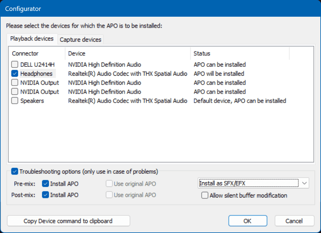 - In the Configurator for Equalizer APO, try selecting different options in the “Troubleshooting options” dropdown box, such as SFX/EFX, SFX/MFX, or LFX/GFX, depending on your Windows version.