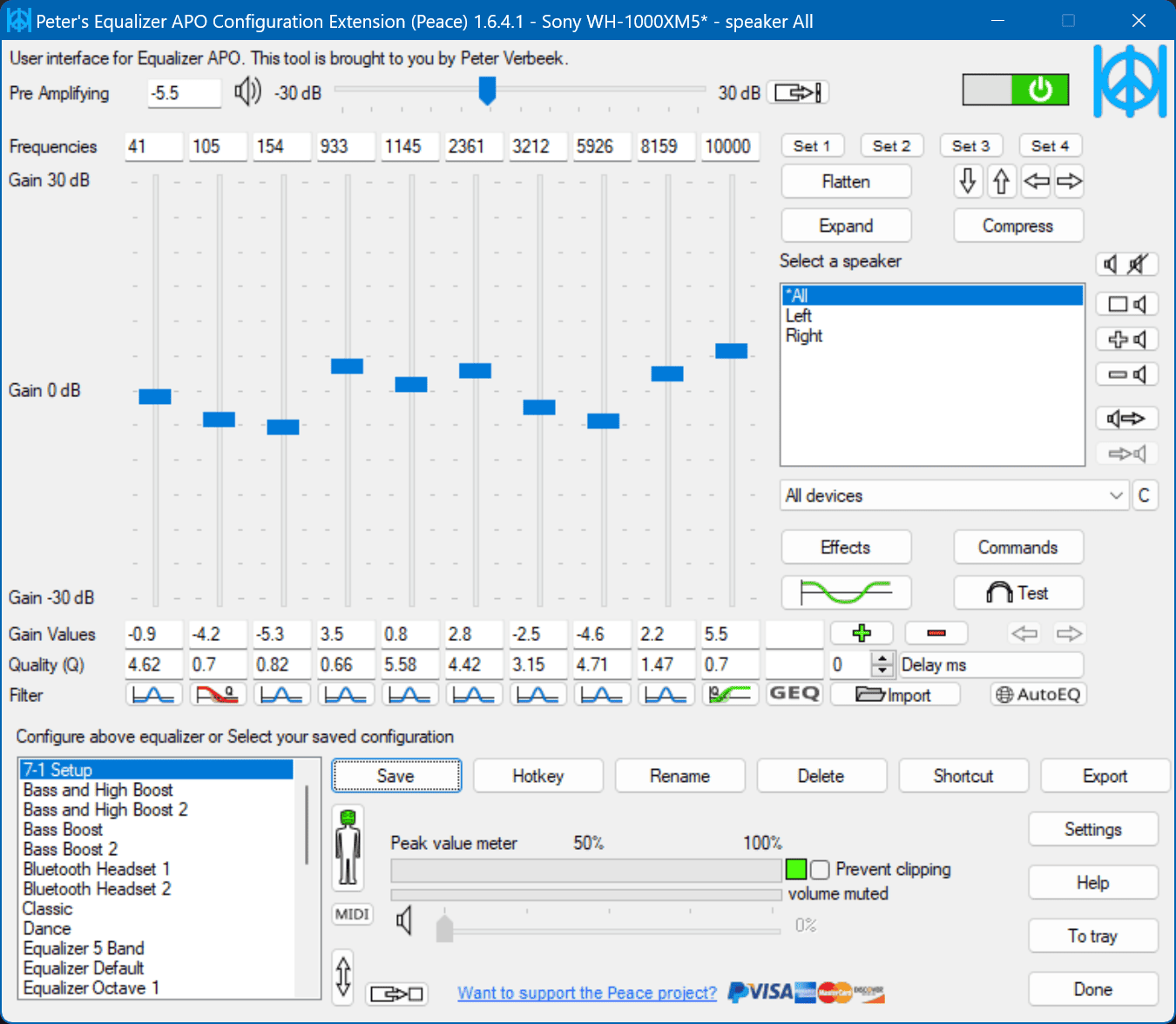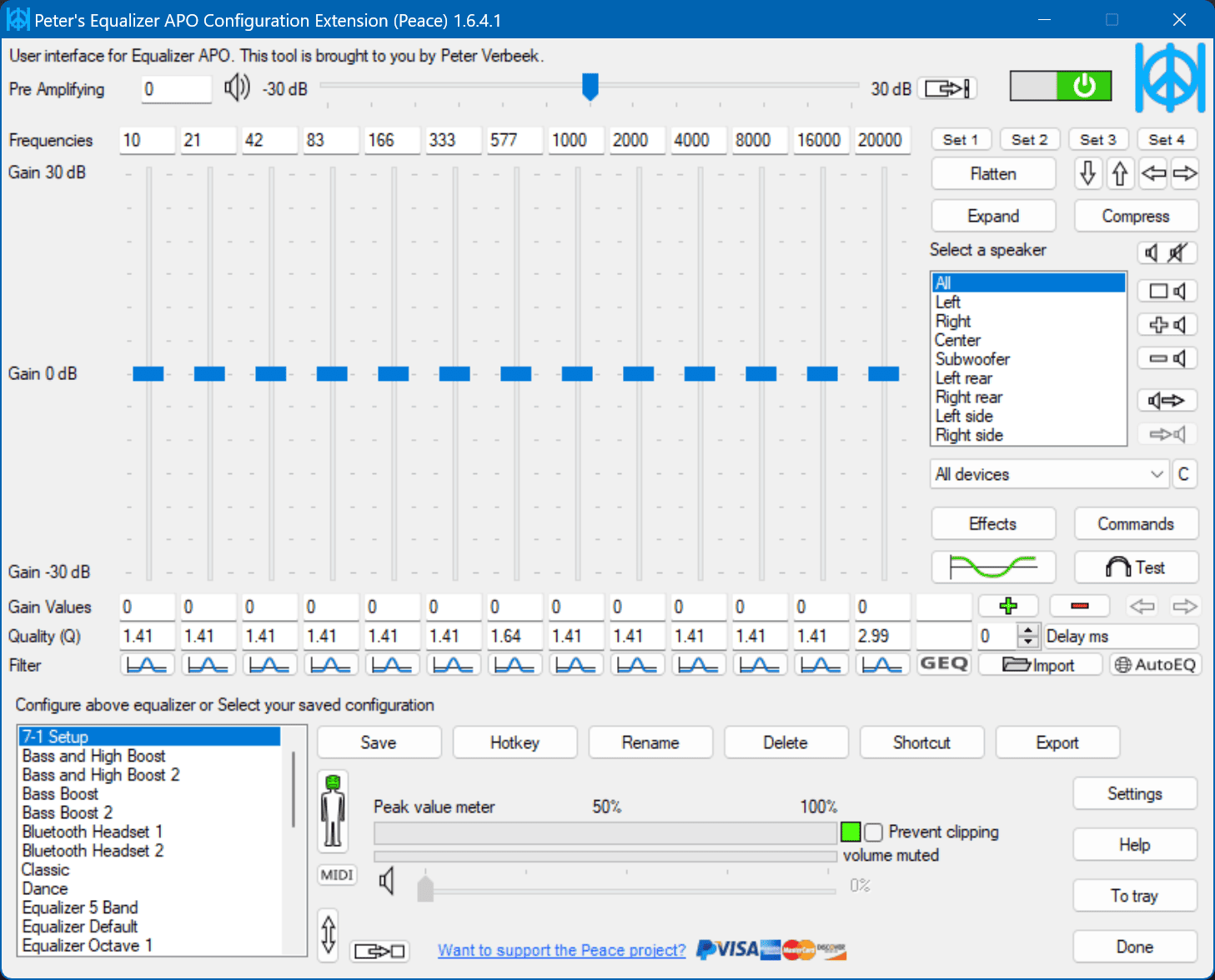 Peace stands for Peter’s Equalizer APO Configuration Extension. It is essentially an interface for Equalizer APO. What is Equalizer APO? It is a parametric/graphic equalizer for Windows, effectively allowing you to filter your audio output.