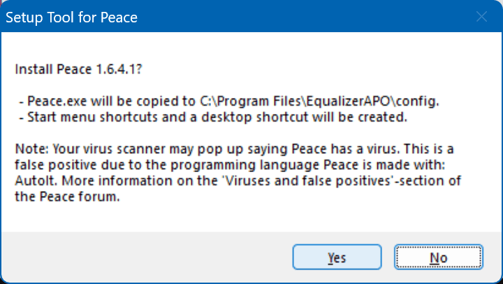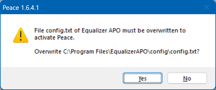 Launch Peace using either the shortcut on the desktop or from the Start Menu. When first launched, Peace will ask you to overwrite the config file in the Equalizer APO directory. Click “Yes.”