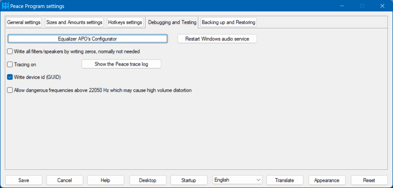 - If you don’t hear any audio changes while adjusting the PEACE GUI sliders, ensure you have installed version 0.9.1 or higher of Equalizer APO. Additionally, check the audio enhancement settings of your device and uncheck the “Use original APO” checkboxes.